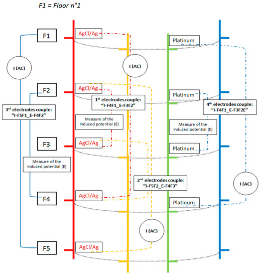 A schematic representation of the multi-parameter probe with the electrodes used for measuring the conductivity is shown on Figure 3. This also shows the four electrode couples that were tested measuring the conductivity. The first electrode couple is I-F4F1_E-F3F2 (AgCl/Ag-based electrodes); the second is I-F5F2_E-F4F3 (AgCl/Ag-based electrodes); the third is I-F5F1_E-F4F2 (AgCl/Ag-based electrodes); and the fourth is I-F4F1_E-F3F2 (Pt electrodes). The letter “I” is associated to the electrodes used for current injection and the letter “E” is associated to those used for measuring the induced potential.