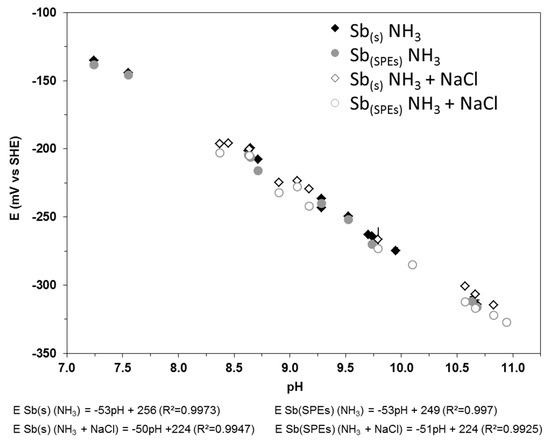 Eh-pH diagram of both the monocrystalline antimony electrode (Sb(s)) and antimony-based screen-printed electrodes (Sb(SPEs)) in ammonia pH buffer solutions, in the absence or presence of 0.1 M NaCl (25 °C, at atmospheric pressure).