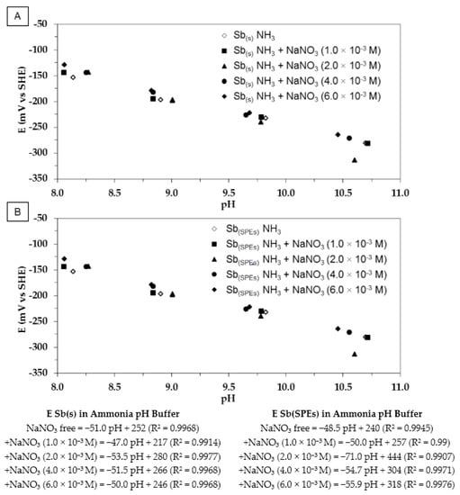 Eh-pH diagram of both Sb(s) (A) and Sb(SPEs) (B). Experiments were done at 25 °C, at atmospheric pressure, in ammonia pH buffer solutions (IS = 0.1) containing NaNO3 (0, 1.0 × 10−3, 2.0 × 10−3, 4.0 × 10−3 and 6.0 × 10−3 M).