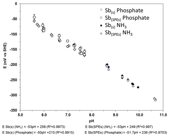 Eh-pH diagram of both the Sb(s) and Sb(SPEs) acquired at 25 °C, at atmospheric pressure, in phosphate and ammonia pH buffer solutions (IS = 0.1).