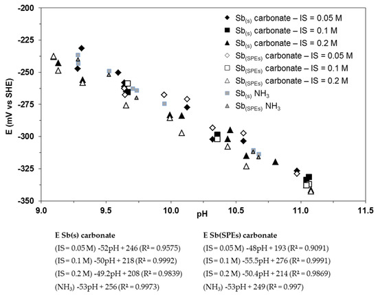 Eh-pH diagram of both Sb(s) and Sb(SPEs). Experiments were run in carbonate pH buffer solutions with various ionic strength (IS) and ammonia pH buffer solution under atmospheric pressure at 25 °C.