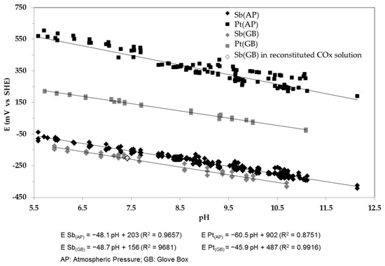 Comparison of calibration curves obtained from antimony (Sb(s) and Sb(SPEs)) and platinum electrodes obtained at 25 °C, under atmospheric pressure and in the glove box. An antimony potential value (vs. SHE) representing the average potential of the electrode in the reconstituted COx solution over one month was added.