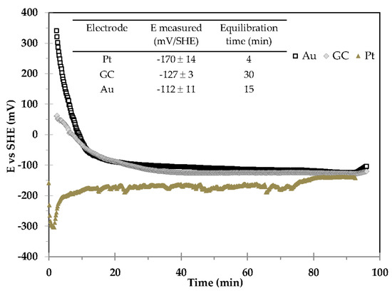 OCP measurements provided by Pt, Au and glassy carbon (GC) electrodes for determining the Eh value confirmed the robustness of platinum as an indicator electrode for this purpose. Voltage measurements by gold and GC electrodes tended towards those provided by platinum ones (same order of magnitude), demonstrating the analytical feasibility of redox measurement via other inert electrodes.