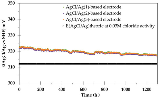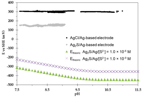 All-solid-state AgCl/Ag/[Cl−] = 0.04 M electrodes showed a constant OCP value (E = 319.2 ± 1.4 mV) over one month of analyses of reconstituted COx pore water in the 7.4–11 pH range. Under the investigated conditions, the electrodes did not show potential drift when subjected to pH variations which opens the possibility of using them as reference electrodes. Under the same conditions and in the absence of S(−II), the OCP of an Ag2S/Ag-based electrode acquires the constant OCP value of E = 151 ± 4.6 mV in the pH range of 7.4 to 9.