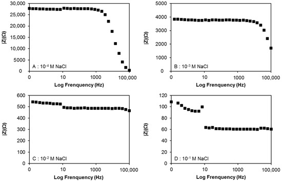 Variation of the impedance values as a function of alternating current frequency resulting from measurements carried out on the second electrode couple (I-F5F2_E-F4F3_AgCl) in sodium chloride solutions of different concentrations: (A) 10−4 M, (B) 10−3 M, (C) 10−2 M, (D) 10−1 M.