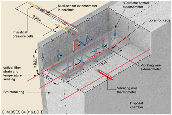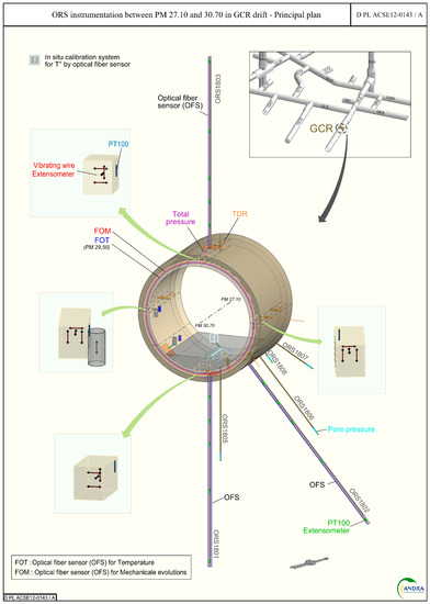 Two ILW-LL cell monitoring demonstrators were realized [24,25]. They are tunnels of 5 m external diameter, with a shotcrete layer covering the host rock, a layer of poured concrete covering the shotcrete, basement construction, then slab and finally vault. In 2011 (respectively 2015), the “GCR” (resp. “GER”) gallery was dug according to the major (resp. minor) horizontal stress field. In these two galleries, several instrumented sections were implemented (see Figure 10), equipped with both classical and innovative sensor technologies (i) Fibre Optic Sensors (FOS), Vibrating Wire Extensometers (VWE), total pressure cells in the shotcrete; (ii) FOS, displacement sensors and pore water pressure in boreholes; (iii) FOS, VWE, Time Domain Reflectometry sensors (TDR) for water content measurement, permeability pulse sensor, total pressure cell. Such structures allow to test temperature and strain measurement solutions in real operating conditions. An instrumented HLW-LL demonstrator had also been realized and is depicted in details in [26].