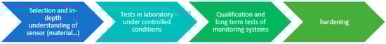 To fulfill these challenging application requirements, several monitoring technologies are considered and would be used in combination inside the repository cells. For each sensing chain, a qualification method in several steps is deployed. First we select the most promising technologies which are tested in controlled situations. If these tests are successful, the sensor can be implemented into real structures, to quantify its impact, integration and response in representative environments. A last step is devoted to the harsh environments vulnerability study: accelerated aging tests, for instance radiation exposure, are organized. This methodology is summarized in Figure 3.