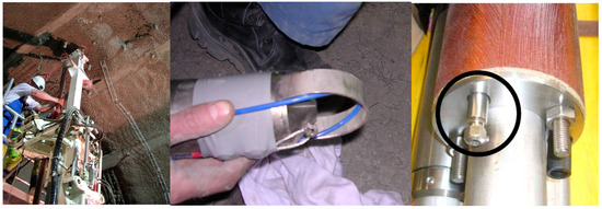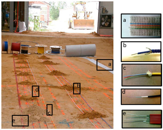 Electricité de France (EDF, the French Electricity Company) and Andra have selected and tested several sensing cables, for soil monitoring, as illustrated in Figure 4 [17]. Similar comparative tests can be also performed for concrete and metallic structure monitoring [18,19]. The selected cables present advantages and drawbacks regarding handling (flexible and easy to install) and durability (metallic reinforced cable).
