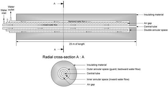In collaboration with Andra and EDF, the Laboratoire National d’Essai (LNE, in Trappes near Paris, France) has built a dedicated facility in order to evaluate and to qualify distributed temperature sensing chains. Spatial resolution of the instrument is typically 1 m; the furnace had thus to be longer than 10 m for ensuring a spatially resolved measurement. As described in extended details in [20] and sketched in Figure 5, the horizontal furnace has a tubular configuration arranged as an assembly of five concentric stainless steel tubes. The central tube (internal diameter of 18 mm) can host 25 m of unrolled optical fibre. This furnace enables to perform temperature measurements with optoelectronic devices, by controlling the stability and homogeneity of the temperature around the fibre and by avoiding any mechanical stress. The fibre is fully free to move inside the tube, and free from any mechanical constraints, besides its own weight. The furnace temperature is controlled and stabilized by a water jacket. Enclosure is insulated to ensure a homogenous temperature field.