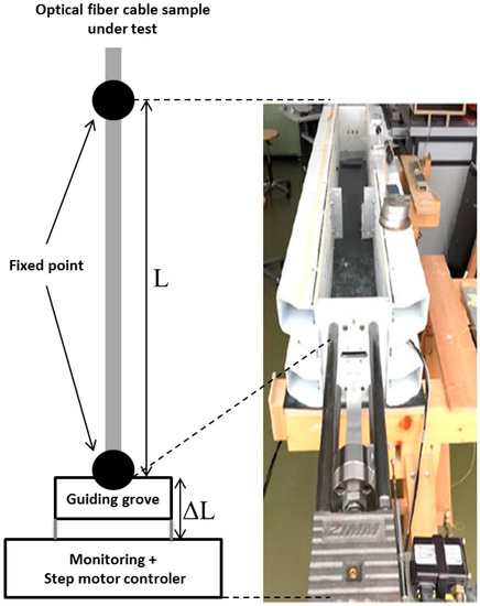 Schematic representation (left) of the bench used to determine fibre optic cables’ sensitivities to strain and pictures (right) from Marmota Company. Adapted with permission from [23]. Copyright 2016 Optical Society of America Publishing.