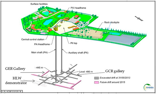 Andra has created an Underground Research Laboratory (URL, see Figure 9) at the beginning of 2000 in the town of Bure in Meuse district, at −490 m under the surface inside the Callovo-Oxfordian clay rock targeted for Cigéo project. Several one-to-one scale demonstrators of repository cells have been realized. Civil engineering designs are similar to those of the target application, but there is no radiation.