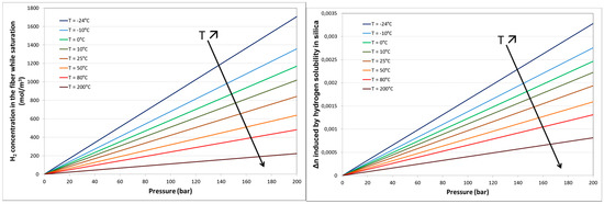 Theoretical values of the pressure and temperature dependence of the H2 saturation concentration in the fibre core center (left) and the related refractive index variation (right).