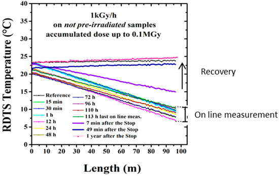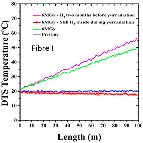 - Cangialosi, C.; Ouerdane, Y.; Girard, S.; Boukenter, A.; Cannas, M.; Delepine-Lesoille, S.; Bertrand, J.; Paillet, P. Hydrogen and radiation induced effects on performances of Raman fiber-based temperature sensors. IEEE J. Light. Tech. 2015, 33, 2432–2438. [Google Scholar] [CrossRef]