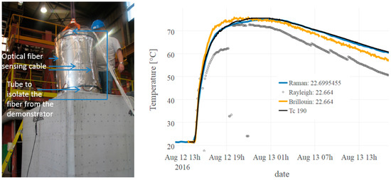 - Planes, S.D.I.; Landolt, M.; Hermand, G.; Perrochon, O. Compared performances of Rayleigh, Raman, and Brillouin distributed temperature measurements during concrete container fire test. In Proceedings of the 25th International Conference on Optical Fibre Sensors (OFS-25), Jeju, Korea, 24–28 April 2017. [Google Scholar]