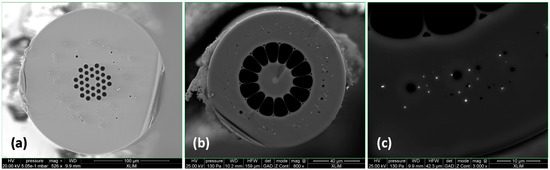 SEM (in the backscattered configuration) pictures of cross-sections of two optical fibres with Pd particles embedded into the silica cladding realized by the powder in tube process: (a) a pure silica core microstructured fibre; (b) a SiO2-GeO2 step index core with a microstructured cladding fibre; (c): zoom-in the cladding region of the fibre.