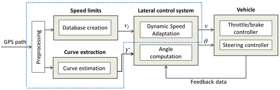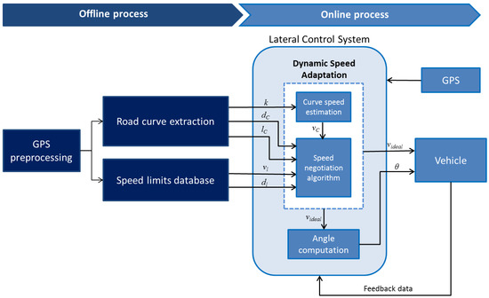 This paper proposes a Dynamic Speed Adaptation (DSA) method for control systems, which together with speed limits database creation and curve extraction, adjusts automatically the vehicle’s speed (see Figure 1). These two approaches, speed limits database creation and curve extraction, are performed off-line including the preprocessing step. Their output provides the main parameters to be analyzed by the speed negotiation algorithm of DSA in order to compute the ideal speed. The identification of sharp curves is performed using GPS positions to define segments that belong to a curve or a tangent line. This is in order to estimate the convenient driving speed for the detected high curvature segments. The speed limit database is created for the traveled paths identifying the positions where speed limits change. As the tracking performance is evaluated through lateral errors, our DSA is tested in simulations with different steering control algorithms. On the modeling level, our proposed work would: