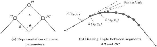 After each curve is defined by its start and end points ( and ), its geometric information, consisting of its radius (R), length (L) and central angle (), is computed through Equations (6) to (8). In order to perform these computations, the center point of the curve (O) is identified following the work [6].
