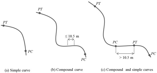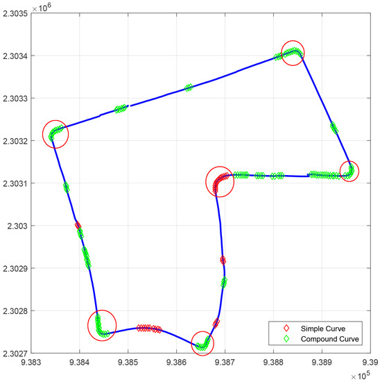 Based on Li et al.’s work [6], curves were classified as simple or compound. A compound curve is a curve formed with at least two consecutive curves separated by a certain distance between each other. In our datasets, this distance was set to 10.5 m, which is the approximation of considering three consecutive points in our preprocessed GPS path. An example of the two types of curves is illustrated in Figure 5.