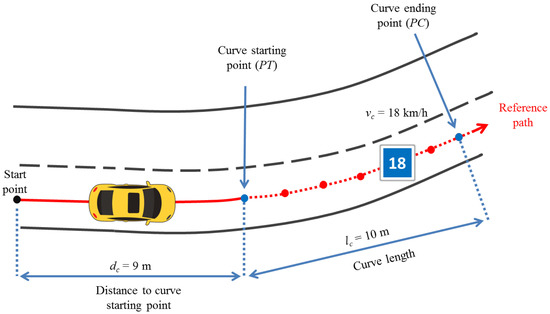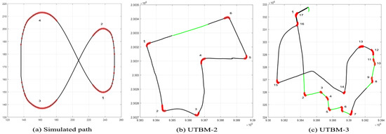 As we are interested in considering only dangerous curves, sharp curves were categorized if their angle ranges from to , or their radius is between 5 and 18 m according to the American Association of State Highway and Transportation Officials’ (AASHTO’s) “A Policy on Geometric Design of Highways and Streets” [43]. Figure 6 shows an example of the curve classification according to [6], and marked in red circles are the sharp curves identified with our method. In this work, only sharp curves are considered to adjust the speed in path-tracking simulations.