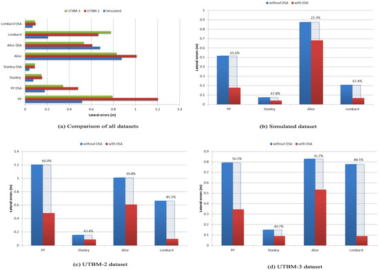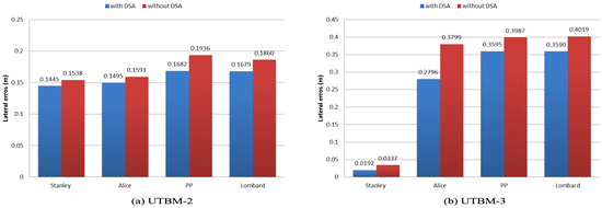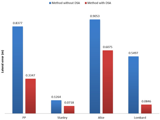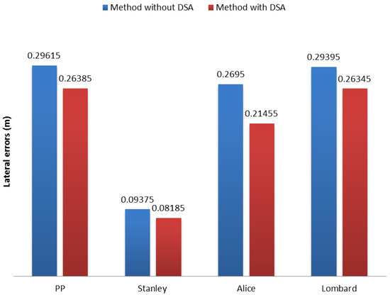 In general, the performance of our DSA method in sharp curves showed significant (at least 10-cm error) improvements for most of the methods (see Figure 16), except for the Stanley method (improvement of around 5 cm). The reason behind this behavior is the definition of its goal point. Since the Stanley method is based on Pure Pursuit (PP) and the goal point is defined with a short distance, it does not suffer greatly from the “cutting corners” effect.
