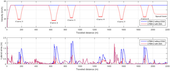 It is well known in the path-tracking literature that vehicle speed may increase or decrease lateral errors. In the ideal case, a good definition should lead the vehicle to track the trajectory accurately (with no errors) [38]. For this reason, most of the works have focused on defining a maximum speed (which is usually a small value [11,39]) to tune the best performance with their algorithms. Nevertheless, speed variations in different situations need to be considered to simulate human driving behavior. The objective of our proposed DSA method is to simulate this behavior.