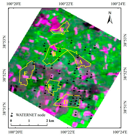 Study area in the middle reaches of the Heihe River Basin: the image was obtained from HJ satellite, combined by band 3 (RED), band 4 (NIR) and band2 (GREEN); the numbered yellow polygons indicate the selected irrigation fields in study area: A is JC-6, B is SQ-1, C is STZ-1, D is WX-4, E is XM-2, and F is ZH-6.