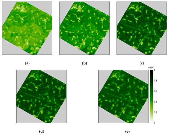 Five available NDVI maps from 10 June 2012 to 15 July 2012: (a) is on 15 June; (b) is on 19 June; (c) is on 29 June; (d) is on 8 July; and (e) is on 13 July.