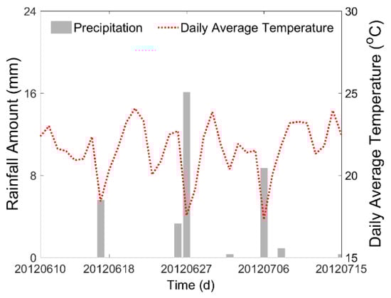 Precipitation condition and daily average temperature of the study area from 10 June 2012 to 15 July 2012.