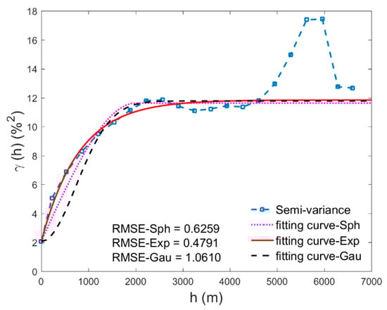 Three commonly used semivariogram models: Spherical (Sph) model, Exponential (Exp) model, and Gaussian (Gau) model, were compared here to find the optimal model for semivariogram fitting. The model equations are shown in Equations (11)–(13):