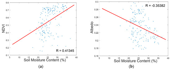 In Figure 5a,b, the NDVI and albedo data were collected from five available HJ satellites images to compare with the soil moisture data observed by WSN of the corresponding dates. As can be seen from the comparison results, the NDVI and albedo are correlated to soil moisture to a certain extent, but the correlation coefficient is not significant (absolute value less than 0.5). An explanation of this result may be that NDVI can reflect the vegetation status, and vegetation usually grows good when soil moisture is abundant [50]. However, in irrigated land, all the fields get enough irrigation; then the correlation between soil moisture and NDVI are weakened. In sparsely vegetated land, the albedo of dry soil is usually higher than that of wet soil [48]. Therefore, there is a correlation between soil moisture and albedo, but this correlation can be disturbed by soil type and the presence of vegetation. Actually, it is usually considered impossible to estimate soil moisture from visible and near infrared remote sensing data.