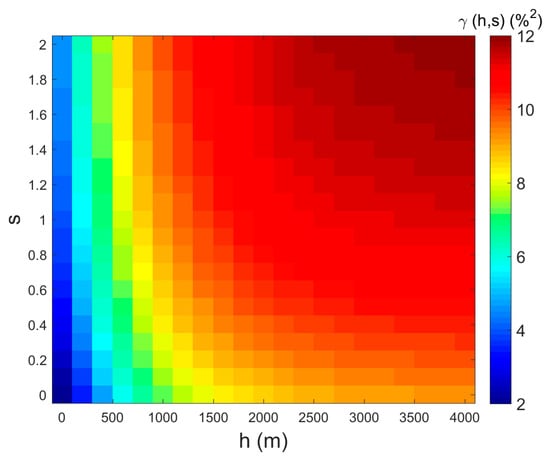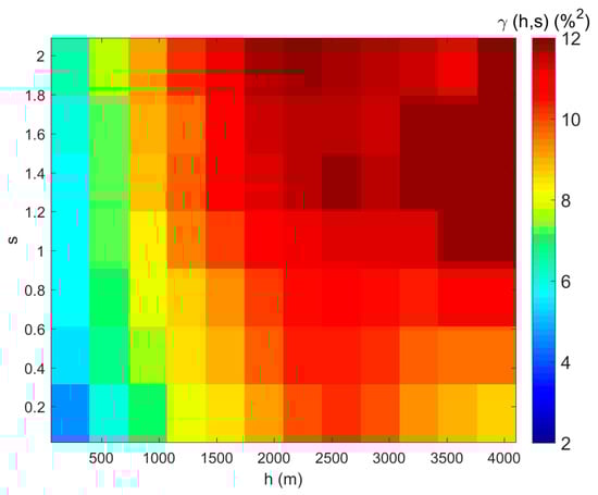 Correspondingly, the semivariance calculation and the semivariogram model was extended to the spatial and spectral combined space. We also used the soil moisture map to derive the semivariance statistics, and the de-trending process was also done before the calculation. The spatial and spectral distance were divided into twenty bins respectively. The bin values with insufficient sample numbers were removed before semivariogram fitting. We only used the data when h ≤ 4000 m and s ≤ 2 in the fitting process. The semivariance, as a function of h and s, is shown in Figure 6. We estimated the nugget at our shortest lag of 30 m, and shortest spectral lag of 0.005, which is millesimal of the largest spectral distance. The nugget value is 1.8875.