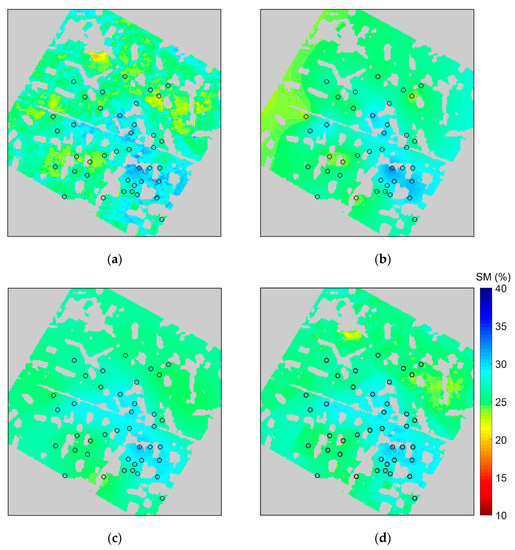 Interpolated soil moisture (SM) at depths of 10 cm on 10 July 2012, using WSN measured data: (a–d) are respectively the results of the Extended Kriging, OK, Co-kriging, and KED methods; the circles in maps represents the WATERNET nodes.