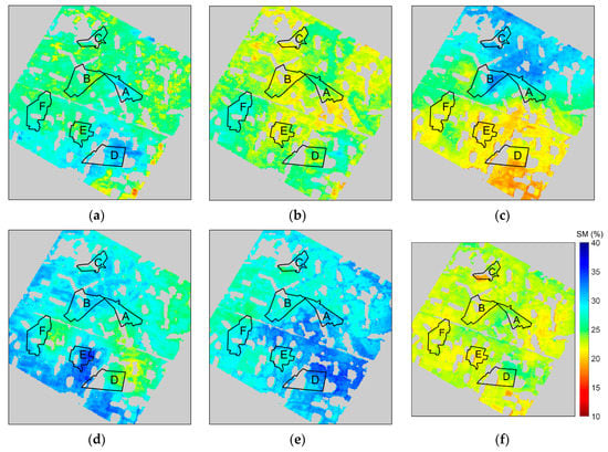 Interpolated soil moisture (SM) maps by Extended Kriging method in the study area: the subfigures corresponds to the dates of 10 June (a), 17 June (b), 24 June (c), 1 July (d), 8 July (e) and 15 July (f), 2012, respectively; six irrigation fields are shown in maps: A is JC-6, B is SQ-1, C is STZ-1, D is WX-4, E is XM-2, and F is ZH-6 .