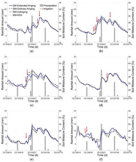 To verify the authenticity of the time series of the interpolated soil moisture map, we chose six irrigation fields in the study area and compared the estimated results of Extended Kriging method and three other methods with the precipitation and irrigation data on temporal series from 10 June 2012 to 15 July 2012. Figure 9 shows the soil moisture spatial distribution of the six irrigation fields. The comparison results are shown in Figure 10. As shown, the precipitation records indicate that there was rain on 17 June, 26 June, 27 June, 3 July, 6 July, 8 July, and 15 July. Furthermore, the irrigation dates are different for different fields. It is clear that the soil moisture value increases in response to the precipitation or the irrigation, and then gradually decreases as the fields dry out.