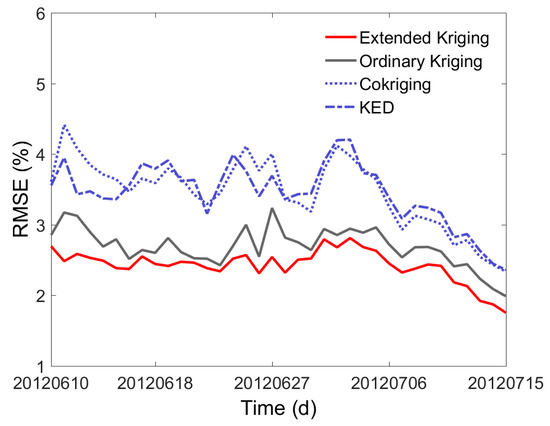 The leave-one-out cross-validation was also used for accuracy evaluation. Figure 11 is the time series of the average RMSE of all available WSN nodes, derived from the leave-one-out method. As is seen from Figure 11, the RMSE values of OK are higher than that of Extended Kriging, and are lower than those of Co-kriging and KED. This means that in condition of the weak correlation between soil moisture and the two remote sensing variables, our Extended Kriging method can make use of the two indirectly related variables to improve the estimation of soil moisture distribution, while the Co-kriging and KED methods didn’t perform that well. This indicates that our Extended Kriging method is more applicable when the correlation between object variable and auxiliary variable is relatively weak.
