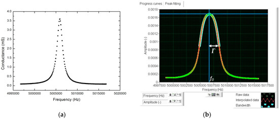 The crystal quartz was connected to an Agilent 4294A Precision Impedance Analyzer (Agilent Technologies, Santa Clara, CA, USA) ranging from 40 Hz to 110 MHz. The real part of the admittance (Figure 2a) was acquired around the resonance (fundamental and third harmonic) using a span of 20 kHz after performing an average of 20 signals. This spectrum was digitalized in 801 points. To improve the resolution, a cubic interpolation with a frequency step of 0.05 Hz, was used in the bandwidth region (see Figure 2b). The resonance frequency (f0) was determined as the peak maximum conductance (real part of the admittance), which corresponds to the series resonant frequency of the equivalent circuit Butterworth-van Dyke [38,39]. The bandwidth (2Γ) was calculated as the difference between the two frequencies at which the amplitude of the conductance equals the maximum value divided by two.