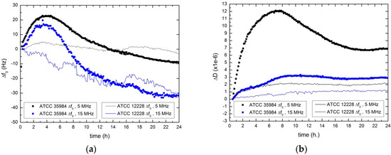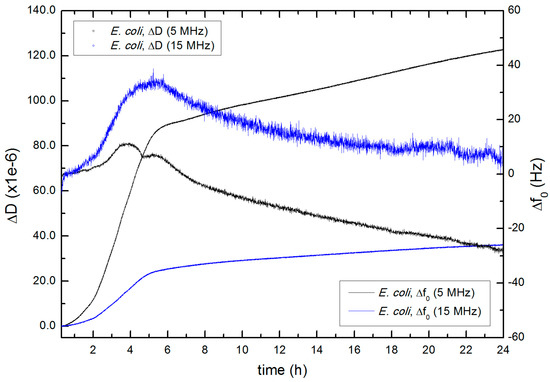 In relation to the frequency, the behavior of Δf0 and ∆D show a similar trend for 5 MHz and 15 MHz in Figure 5. As it was described for the 5 MHz curve, the 15 MHz Δf0 curve increases during the first hours as a result of the biofilm adhesion. For both frequencies the difference among the producing and non-producing strain at the maximum frequency increment reaches 20 Hz approximately. The dissipation factor also exhibits an increasing trend at 15 MHz, although the changes are less pronounced for this third harmonic.