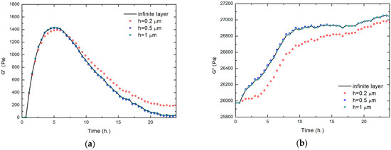 Influence of thickness, h, biofilm layer during its formation. Time curve of the real shear modulus, G′ (a) and the imaginary shear modulus; G″ (b) at the frequency of 5 MHz. S. epidermidis ATCC 35984 producing strain.