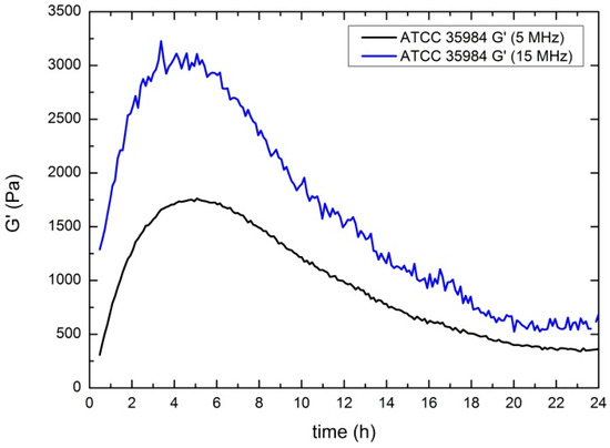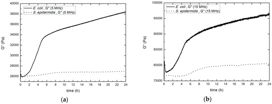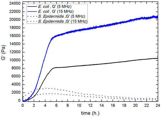 Values of the real shear modulus were calculated and compared to S. epidermidis biofilm at 5 MHz and 15 MHz (Figure 10). This curve shows that the biofilm formed by the E. coli strain is much stiffer than that formed by S. epidermidis, being its G′ values higher from the first 2 h of biofilm formation. The G′ values of E. coli and S. epidermidis reach 8200 Pa and 1750 Pa respectively, at 5 MHz, and 16,000 Pa and 3000 Pa at 15 MHz. The decreasing trend of this parameter found in the case of S. epidermidis, does not appear for E. coli, at least during the first 24 h of culture.