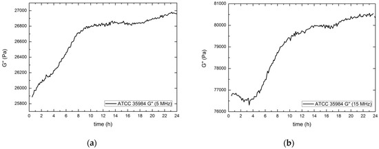 The main feature is the significant increase in G′ values, reaching a maximum after the first 4–5 h. The following decrease of G′ values detected could be compatible with a loss of rigidity probably caused by the consumption of some of the nutrients present in the EPS by bacteria, by the increasing acidity of the growth medium [12] or by some other metabolic result. In Figure 8, the results corresponding for the imaginary shear modulus both 5 MHz (a) and 15 MHz (b) are shown.