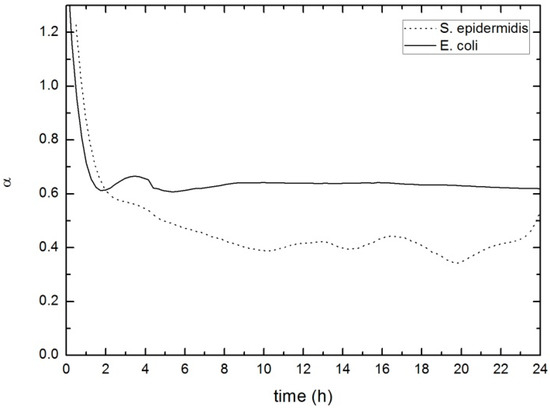 Evolution of the power-law exponent –α- for the biofilm formed by S. epidermidis (dot line) and by E. coli (solid line).