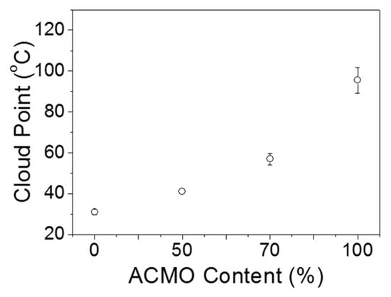 In this study, a variation in the LCST was anticipated due to the copolymerization of ACMO and NIPAAM, which exhibit LCSTs of 88 °C and 33 °C, respectively, in aqueous systems. In order to verify this hypothesis, radical copolymerizations of PACMO-PNIPAAM were undertaken at four different ACMO contents (0, 50, 70, and 100 wt %), with each using azobisacrylonitrile (AIBN) as an initiator. The four copolymers were individually dissolved in water at 10 wt % concentration, and the cloud points were measured (see (Figure S1) for some examples). The average cloud points are plotted in Figure 2, which shows the elevation of the LCST of the copolymer with the increased ACMO contents.