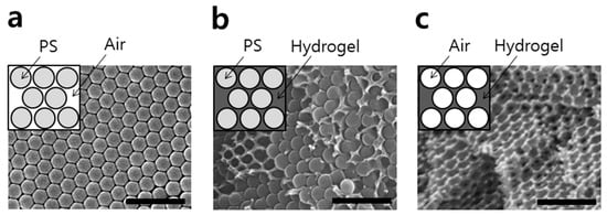 In order to obtain different temperature-driven swelling responses, the molar ratios of ACMO and NIPAAM in a polymerization mixture (m:n) were controlled to be 50:0, 35:15, 25:25, 15:35, and 0:50, respectively. In this study, we fabricated the periodic structure via the opal-templated photopolymerization of the hydrogel. An opal-templated photonic gel exhibits a periodic modulation of the refractive indices within a gel, and an appropriate periodic distance allows it to exhibit a specific color due to the Bragg diffraction from the periodic inverse opal (IO) structure. Figure 3a shows a PS opal template fabricated by the flow-cell method [23].