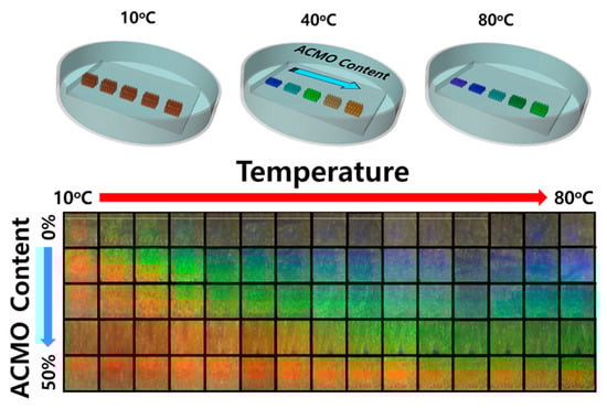 Copolymerization of NIPAAM with other functional monomers has enabled a variety of dual sensors for factors such as temperature-pH [13,14], temperature-glucose [17], and temperature-light [10]. It should be noted, however, that the use of NIPAAM limits the possible temperature ranges to be around the LCST of NIPAAM; this means that there is a negligible shrinkage in volume at temperatures above 40 °C. The LCST phenomenon of a specific polymer system can be thus useful to develop a novel polymer thermometer [18,19]. In this study, noting that ACMO has a higher LCST than NIPAAM, those two thermoresponsive vinyl monomers are simultaneously incorporated within an opal template in order to investigate temperature-sensing photonic gel operating at high temperatures (i.e., above 50 °C).