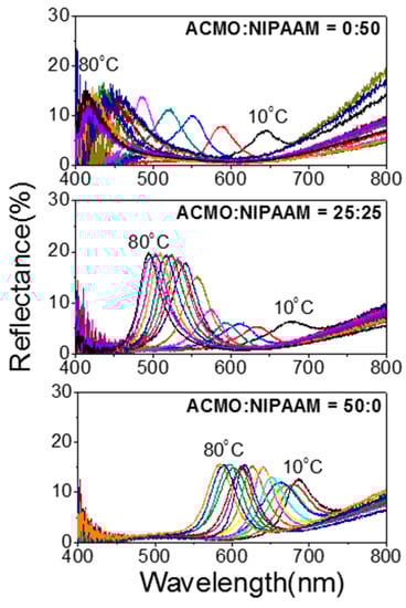 The results shown in Figure 6 imply that the color tunability of the thermochromic sensor can be easily controlled by changing the mixing ratio of ACMO and NIPAAM, and the temperature sensing range can be higher than 50 °C. There have been reports of thermochromic photonic sensors using NIPAAM, but the detection of temperature change was limited to 40 °C due to its low LCST (~33 °C). The thermochromism of the photonic gel sensors was investigated up to 80 °C, above which it both took a long time for the temperature to reach an equilibrium, and a bubble started to form inside the photonic gel.