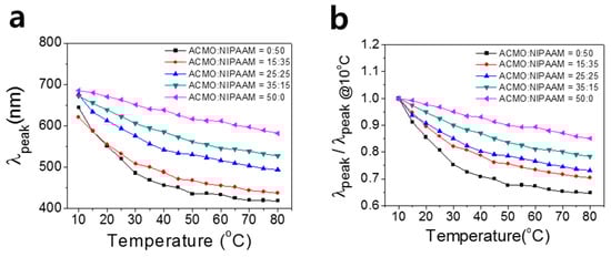 During temperature rise, λpeak for each sensor was obtained from each spectrum and plotted as a function of temperature, as shown in Figure 6a. Furthermore, λpeak was normalized to the value of the lowest temperature for each sensor and plotted, as shown in Figure 6b. In Figure 6a, temperature variations from 10 to 80 °C for a thermochromic gel with 50% NIPAAM (0% ACMO) brought about a change in λpeak from 645 nm to 415 nm, with a steeper slope (dλpeak/dT) for the low temperature regime. A photonic gel with 100% ACMO, however, exhibited a less steep slope (dλpeak/dT) but had linear temperature-driven spectral changes at the temperature ranges of 10–80 °C. The distinct slopes in the T-dependent λpeak positions from the five thermochromic gels originate from the different LCSTs of NIPAAM and ACMO. Since the LCST of ACMO is higher than that of NIPAAM, the shrinkage of the ACMO hydrogel with temperature rise occurs at a higher temperature than that of the NIPAAM gel. For this reason, higher ACMO content in the photonic gel exhibited steeper at high temperature region. Particularly at 70–80 °C temperature ranges in Figure 6, the dλpeak/dT values of photonic gels with three different ACMO content (0%, 25%, 50%) were calculated to be 0.8 nm/°C, 1.8 nm/°C, and 2.5 nm/°C respectively.