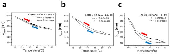 Hysteresis plots of the temperature-dependent stopband positions (λpeak) of three different IO photonic gels with relative ACMO contents of (a) 100%, (b) 50%, and (c) 0%. Heating and cooling rate was set as 5 °C/min, and equilibrated for 30 min at each designated temperature before optical measurements.