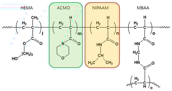 The molecular structure of a thermochromic gel consisting of HEMA as a hydrogel building block, ACMO and NIPAAM as the thermochromic gels, and NBAA as a crosslinker, which are random-copolymers with molar ratios of l:m:n:o.