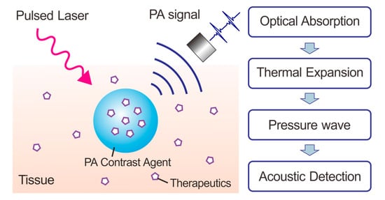 Photoacoustic (PA) technology has emerged as a promising imaging modality that has attracted increasing interest for biomedical applications during the past decades [1,2,3,4]. The PA effect, first discovered by Alexander G. Bell in 1880 [5,6], describes the formation of acoustic waves following absorption of light pulses. More than a century after the discovery of the PA effect, photoacoustic imaging (PAI) was introduced to biomedical applications. Since the pioneering work by Wang et al. that realized in vivo PAI in a rat brain in 2003 [7], non-invasive PAI has been extensively explored as a technology for biomedical imaging and diagnostics [8,9,10,11,12,13]. The mechanism of PAI is based on the energy transformation among light, heat and sound (Figure 1). When illuminated with a pulsed laser, PAI contrast agents in tissue rapidly absorb energy and generate heat causing thermalelastic expansion and emitting mechanical pressure waves at ultrasonic frequencies. The periodic sound waves can be detected by pressure transducers close to the tissue and output to form images. This imaging mechanism endows deeper tissue penetration up to 5–6 cm as compared to the traditional optical imaging modalities that have limited imaging depth within 1 mm [14]. In addition, PAI imaging offers higher spatial resolution up to 5 μm, due to the weaker scattering of ultrasonic signals as compared to light signals [15,16,17,18].