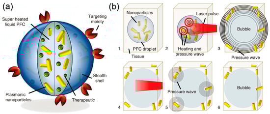 Numerous reports have demonstrated that Au nanostructures may be designed as drug carriers for PAI-guided chemo/photothermal therapy (PTT) [20,21,37,61,62,63]. For example, Wilson et al. developed liquid perfluorocarbon nanodroplet-encapsulated Au NRs as a PA and ultrasound imaging agent, as well as a potential drug carrier (Figure 2) [64]. The heat generated by Au NRs under laser causes the perfluorocarbon to undergo a phase transition (liquid-to-gas), resulting in subsequent loading release. The researchers found that the PA signal was enhanced due to the vaporization of perfluorocarbon as compared to the signal from Au NRs that were produced thermal expansion only. Taking advantage of this design, the Xing group loaded paclitaxel and Au NRs into perfluorohexane nanodroplets for PAI-guided chemotherapy and additionally functionalized the nanodroplets with folic acid for tumor targeting [65]. Upon application of a pulsed laser, the nanodroplets were rapidly destroyed due to the vaporization of perfluorohexane, resulting in rapid drug release. Researchers have demonstrated enhanced tumor suppression as a result of photoacoustic-chemo synergistic treatment, where the integration of chemotherapy with PTT not only achieved controlled and localized drug release, but also promoted the cellular uptake, thus leading to improved therapeutic efficacy. Moreover, the chemotherapy was shown to suppress tumor recurrence and metastasis that may be caused by inhomogeneous ablation with PTT alone.